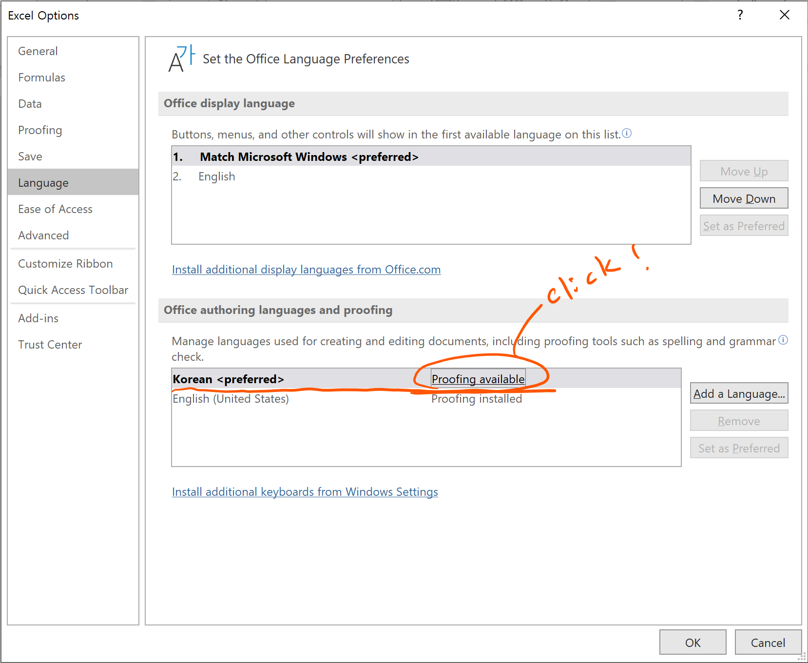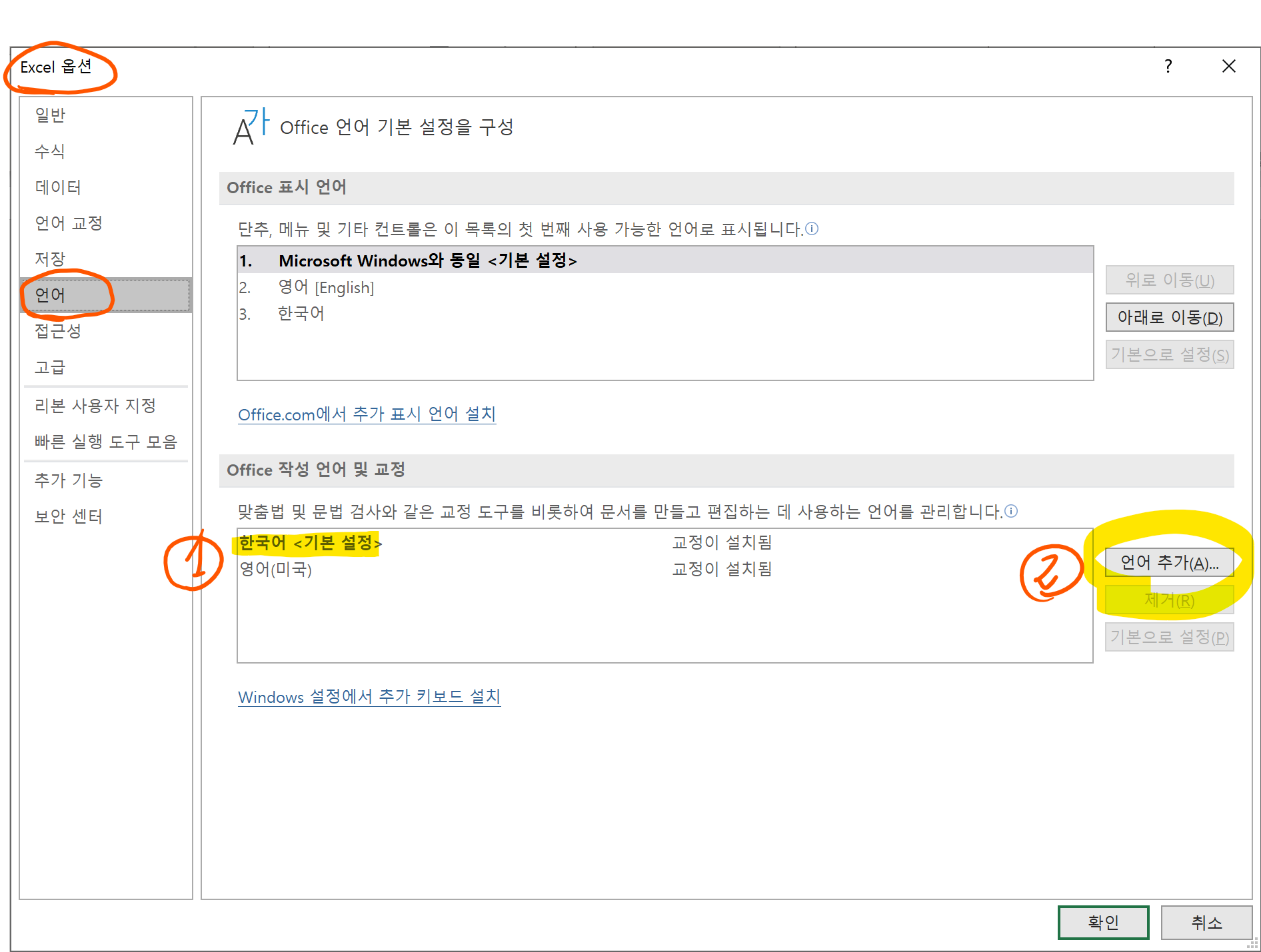 1. 언어 탭 -> Office 작성 언어 및 교정